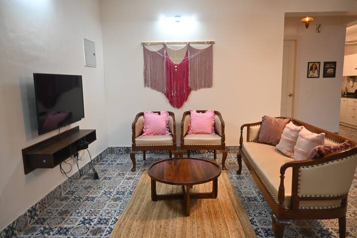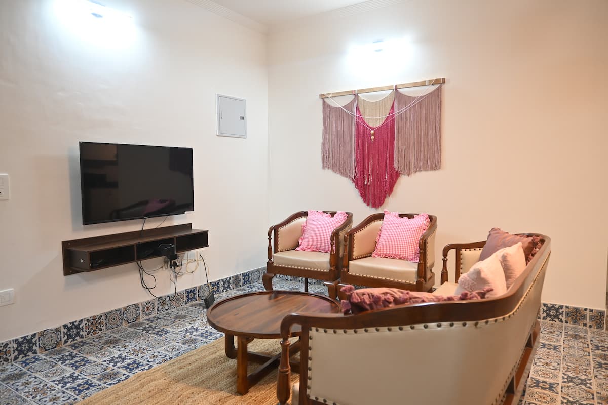 A modern, airy space with plush seating, Smart TV, and high-speed Wi-Fi. Perfect for relaxing, entertaining, or working, with bright natural light and a cozy, contemporary vibe.